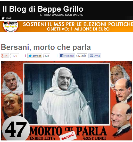 «Ο Μπερσάνι μας ‘παρενοχλεί’ πολιτικά. Επί μέρες μας ζαλίζει με προτάσεις απρεπείς αντί να παραιτηθεί όπως θα έκανε κάθε άλλος στη θέση του. Κατάφερε μέχρι και να χάσει κερδίζοντας» γράφει ο Γενοβέζος κωμικός στο μπλογκ που έγινε το όχημα της εκλογικής καθόδου ενός «μη πολιτικού» κινήματος με ασαφή προσανατολισμό, με το οποίο κάνει τώρα πολιτική ο Μπέπε Γκρίλο.