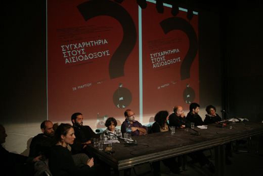 Στη συζήτηση πήραν μέρος οι συντελεστές της ταινίας (διαβάστε περισσότερα για την ταινία εδώ), η εγκληματολόγος Αρετή Κουκουτσάκη, ο ποιητής Λευτέρης Βασιλόπουλος, οι δημοσιογράφοι Ματθαίος Τσιμιτάκης και Χρήστος Ζέρβας και ο εικαστικός Μάριος Σπηλιόπουλος.