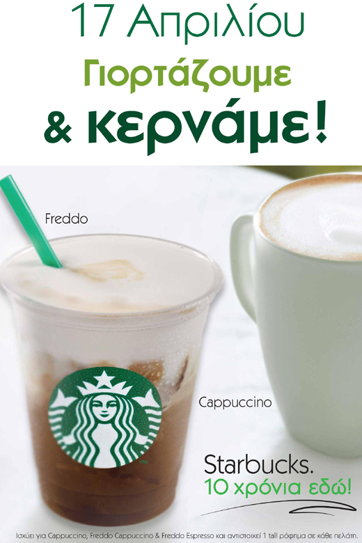 Την Τετάρτη 17 Απριλίου και για ΟΛΗ την ημέρα, σάς προσκαλούν να απολαύσετε ΔΩΡΕΑΝ: tall Cappuccino, Freddo Cappuccino & Freddo Espresso! Για περισσότερες πληροφορίες, απευθυνθείτε στους barista των Starbucks ή επισκεφθείτε τη σελίδα www.facebook.com/StarbucksGreece