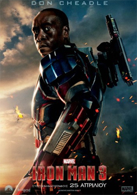 ![]() | Col. James Rhodes (Rhodey) – Don CheadleΟ Rhodey είναι ο σύνδεσμος μεταξύ του Stark και της πολεμικής αεροπορίας. Είναι επιστήθιος φίλος του, ένας από τους ελάχιστους έμπιστους του Stark, διακρίνεται από τεράστια υπομονή και ανοχή, για τον ανατρεπτικό και σταθερά απρόβλεπτο φίλο του. Ο Rhodey, έχει καινούρια στολή σε κόκκινες, ασημένιες και μπλε πατριωτικές αποχρώσεις, που τον μεταμορφώνει σε Iron Patriot, στο Iron Man 3. |