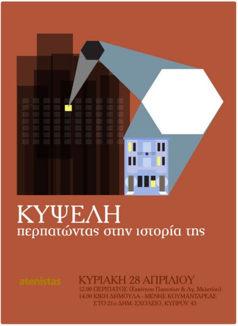 Αυτή την Κυριακή οι Atenistas δίνουν ραντεβού στην Κυψέλη. Κάτοικοι, λογοτέχνες, ηθοποιοί και αρχιτέκτονες σκιαγραφούν την ιστορία της γειτονιάς, όπου έζησαν και δημιούργησαν ο Οδυσσέας Ελύτης, ο Νίκος Γκάτσος και ο Χαρίλαος Τρικούπης. Οι Atenistas με τη συμμετοχή του αρχιτέκτονα Νίκου Καβαδά, οργανώνουν περίπατο στα στενά της περιοχής. Στο τέλος του περιπάτου θα μοιραστούν μνήμες και ιστορίες από τη δική τους Κυψέλη η κορυφαία ποιήτρια, Κική Δημουλά και ο λογοτέχνης, Μένης Κουμανταρέας.