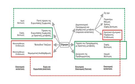 Από το διάγραμμα αυτό γίνεται σαφές ότι μπορεί να υπάρξουν και διάφοροι συνδυασμοί ευρωπαϊκών εξελίξεων και εσωτερικής οικονομικής κατάστασης. Είναι μάλιστα εμφανές ότι ο συνδυασμός εκδοχών που περιγράφονται με τις κόκκινες γραμμές μπορεί να δημιουργήσει μία εξαιρετικά ευνοϊκή συγκυρία για την Ελληνική οικονομία. Εάν αυτό συνέβαινε, δε θα πιστεύαμε στα μάτια μας για την ανάκαμψη που θα βλέπαμε. Από την άλλη μεριά υπάρχει και ένας εξαιρετικά δυσμενής συνδυασμός. Αυτός που συνδυάζει το «βελούδινο» διαζύγιο και τη νομισματική αναδιάρθρωση με την εμφάνιση αρνητικών εξωτερικών παραγόντων.