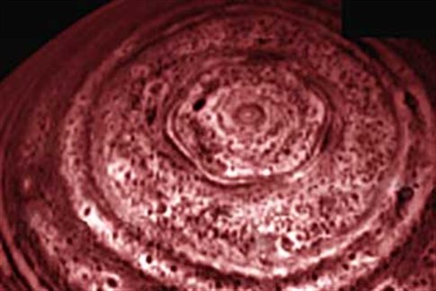 Η δίνη περιστρέφεται μέσα σε ένα μυστηριώδες εξάγωνο, το οποίο εικονίζεται εδώ σε παλαιότερη υπέρυθρη λήψη (NASA/JPL-Caltech)