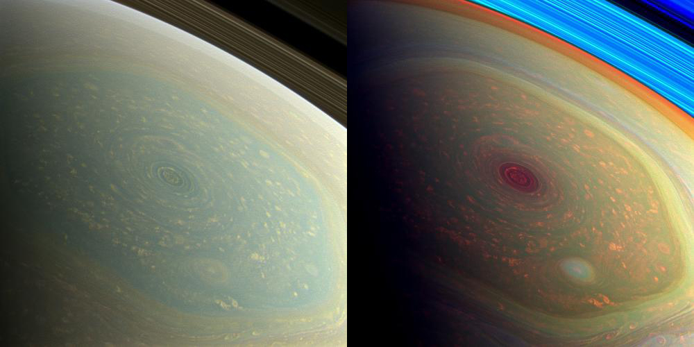 Αριστερά η δίνη σε εικόνα πραγματικού χρώματος, δεξιά η ίδια εικόνα με επεξεργασμένα χρώματα ώστε να διακρίνονται λεπτομέρειες (NASA/JPL-Caltech)