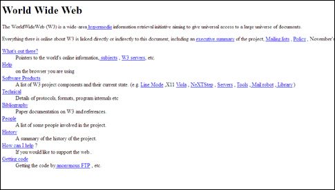 Η πρώτη ιστοσελίδα στην ιστορία του Διαδικτύου, της οποίας το περιεχόμενο είναι διαθέσιμο εδώ, λειτουργούσε στη διεύθυνση info.cern.ch. Βρισκόταν αποθηκευμένη σε δύο υπολογιστές NeXT, τους οποίους παρήγαγε τη διετία 1988-1990 η ομώνυμη εταιρεία του Στιβ Τζομπς, ο οποίος είχε τότε εκδιωχθεί από την Apple.