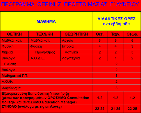 Οι μαθητές που πρόκειται να φοιτήσουν στα τμήματα θερινής προετοιμασίας για τη Γ Λυκείου θα καλύψουν σημαντικό μέρος της ύλης της συγκεκριμένης τάξης, ενώ αυτοί που θα φοιτήσουν στα αντίστοιχα τμήματα προετοιμασίας για τη Β Λυκείου, θα έρθουν σε ουσιαστική επαφή με τη γνωστική ύλη της τάξης.