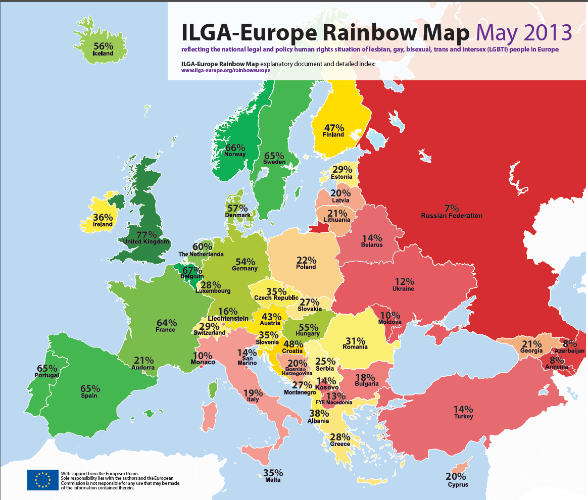 Σε ξεχωριστή μελέτη της ILGA Europe, οργάνωσης για τα δικαιώματα των LGBT, εξετάζεται το θεσμικό πλαίσιο και τα πολιτικά μέτρα που έχουν ληφθεί και έχουν αντίκτυπο στην καθημερινότητα των Ευρωπαίων με «διαφορετική» σεξουαλικό προσανατολισμό. Βάσει αυτών, η οργάνωση κατέταξε 49 χώρες στην Ευρώπη στην κλίμακα πλήρους ισότητας-σοβαρών παραβιάσεων ανθρώπινων δικαιωμάτων.