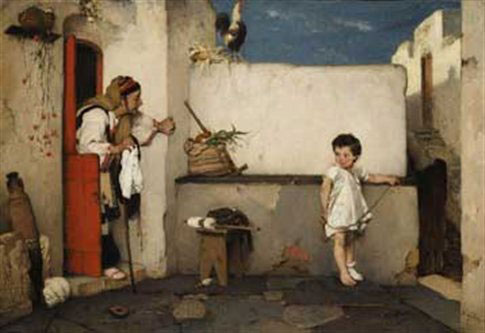 Ο πίνακας παρουσιάζει μια γιαγιά με παραδοσιακή ελληνική φορεσιά να καλεί το μισοντυμένο εγγόνι της, που έχει βγει στην αυλή για να παίξει.