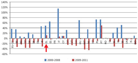 Πιο συγκεκριμένα, οι προοπτικές στα αντίστοιχα επαγγέλματα στην –σε βαθιά ύφεση– Πορτογαλία είναι εντυπωσιακές και εφάμιλλες της περιόδου (διάρκειας σχεδόν μιας δεκαετίας) 2000-2008. Στην Ιταλία παρατηρούμε οριακή αύξηση (μετά από την εντυπωσιακή ενίσχυση της περιόδου 2000-2008) ενώ, σε ό,τι αφορά την Κύπρο (η οποία δεν είχε βρεθεί σε κρίση έως και το 2011) το ποσοστό αύξησης μεταξύ 2009 και 2011 είναι εξίσου μικρό, αλλά παραπλήσιο με το αντίστοιχο ποσοστό αύξησης κατά τη δεκαετία του 2000 (2000-2008)!