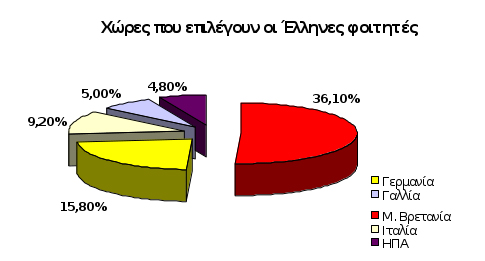 Οι Έλληνες φοιτητές επιλέγουν για τις σπουδές τους κυρίως τη Μ. Βρετανία, τη Γερμανία, την Ιταλία και σε ένα μικρότερο ποσοστό τις ΗΠΑ (ΣΧΗΜΑ 2).