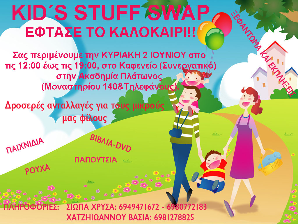 Ανταλλακτικό παζάρι παιδικών ειδών οργανώνεται την Κυριακή 2 Ιουνίου (12 το μεσημέρι με 7 το απόγευμα) στο Καφενείο της Ακαδημίας Πλάτωνος (Μοναστηρίου 140 και Τηλεφάνους). Οι διοργανωτές καλούν τους γονείς να φέρουν μαζί τους είδη που δεν χρειάζονται τα παιδιά τους και να τα ανταλλάξουν με άλλα.