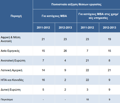 Στον παρακάτω πίνακα παρουσιάζεται η ποσοστιαία αύξηση των θέσεων εργασίας για τους κατόχους τίτλου MBA τα τελευταία δύο χρόνια. Η ζήτηση για κατόχους MBA παρουσιάζει μεγάλη αύξηση όχι μόνο στις αναπτυσσόμενες οικονομίες όπως είναι η Μέση Ανατολή, η Ασία και η Λατινική Αμερική αλλά και στις ανεπτυγμένες οικονομίες. Επιπλέον, οι κάτοχοι MBA είναι ιδιαίτερα περιζήτητοι στον τομέα των χρηματοοικονομικών υπηρεσιών. Χαρακτηριστικό είναι πως στις χώρες της Αφρικής και της Μέσης Ανατολής, στην Ανατολική Ευρώπη, στη Λατινική Αμερική, στις ΗΠΑ και στον Καναδά οι θέσεις εργασίας για τους κατόχους του εν λόγω τίτλου αυξήθηκαν κατά μέσο όρο κατά 22% για το 2011-2012 και κατά 14,5% περίπου για το 2012-2013.