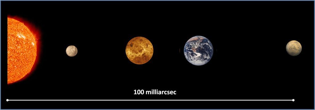 O Ήλιος, ο Ερμής, η Αφροδίτη, η Γη και ο Άρης όπως θα φαίνονταν με το Colossus από απόσταση 50 ετών φωτός. Οι αποστάσεις μεταξύ των σωμάτων δεν είναι υπό κλίμακα (Colossus Consortium)