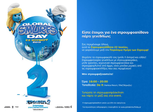 | Στην Αθήνα, ο εορτασμός για την Παγκόσμια Μέρα των Στρουμφ θα πραγματοποιηθεί το Σάββατο, 22 Ιουνίου στο DO IT RESORT στη Βάρκιζα, όπου οι προσκεκλημένοι θα έχουν στη διάθεσή τους μία μεγάλη έκταση με γρασίδι και μία έκταση επί της παραλίας. |