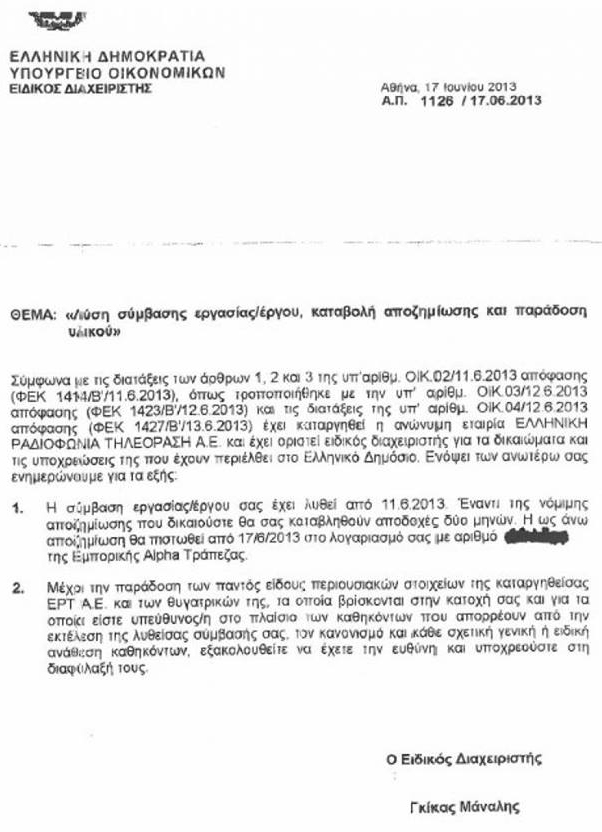 Στο έγγραφο αναφέρεται ότι η ανώνυμη εταιρεία ΕΡΤ ΑΕ έχει καταργηθεί και έχει οριστεί ειδικός διαχειριστής, ο οποίος και ενημερώνει τους εργαζόμενους ότι «η σύμβαση εργασίας ή έργου σας έχει λυθεί από 11 Ιουνίου του 2013. Έναντι της νόμιμης αποζημίωσης, που δικαιούστε θα σας καταβληθούν αποδοχές δύο μηνών».