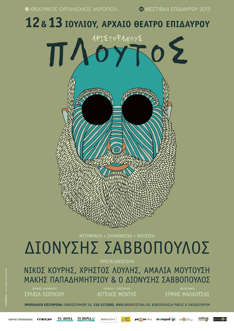 Τη σκηνοθεσία, αλλά και τον πρωταγωνιστικό ρόλο στον «Πλούτο» του Αριστοφάνη, πάνω σε δική του, νέα μετάφραση, αναλαμβάνει ο Διονύσης Σαββόπουλος. Η παράσταση ανεβαίνει στις 12 και 13 Ιουλίου στο Αρχαίο Θέατρο Επιδαύρου.Τη σκηνοθεσία, αλλά και τον πρωταγωνιστικό ρόλο στον «Πλούτο» του Αριστοφάνη, πάνω σε δική του, νέα μετάφραση, αναλαμβάνει ο Διονύσης Σαββόπουλος. Η παράσταση ανεβαίνει στις 12 και 13 Ιουλίου στο Αρχαίο Θέατρο Επιδαύρου.
