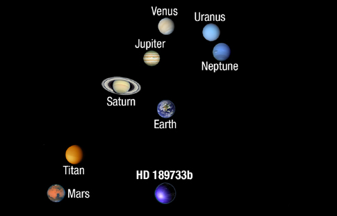 Σύγκριση του πραγματικού χρώματος ανάμεσα στα σώματα του Ηλιακού Συστήματος και τον HD 189733b (Προσαρμογή από NASA, ESA, and A. Feild)