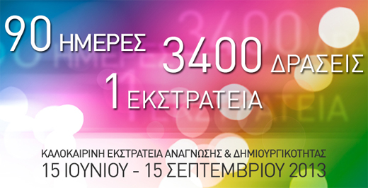 103 Δημόσιες και Δημοτικές βιβλιοθήκες της χώρας μας οργανώνουν, από 15 Ιουνίου έως 15 Σεπτεμβρίου 2013, την Καλοκαιρινή Εκστρατεία Ανάγνωσης, Δημιουργικότητας και Καινοτομίας για παιδιά.