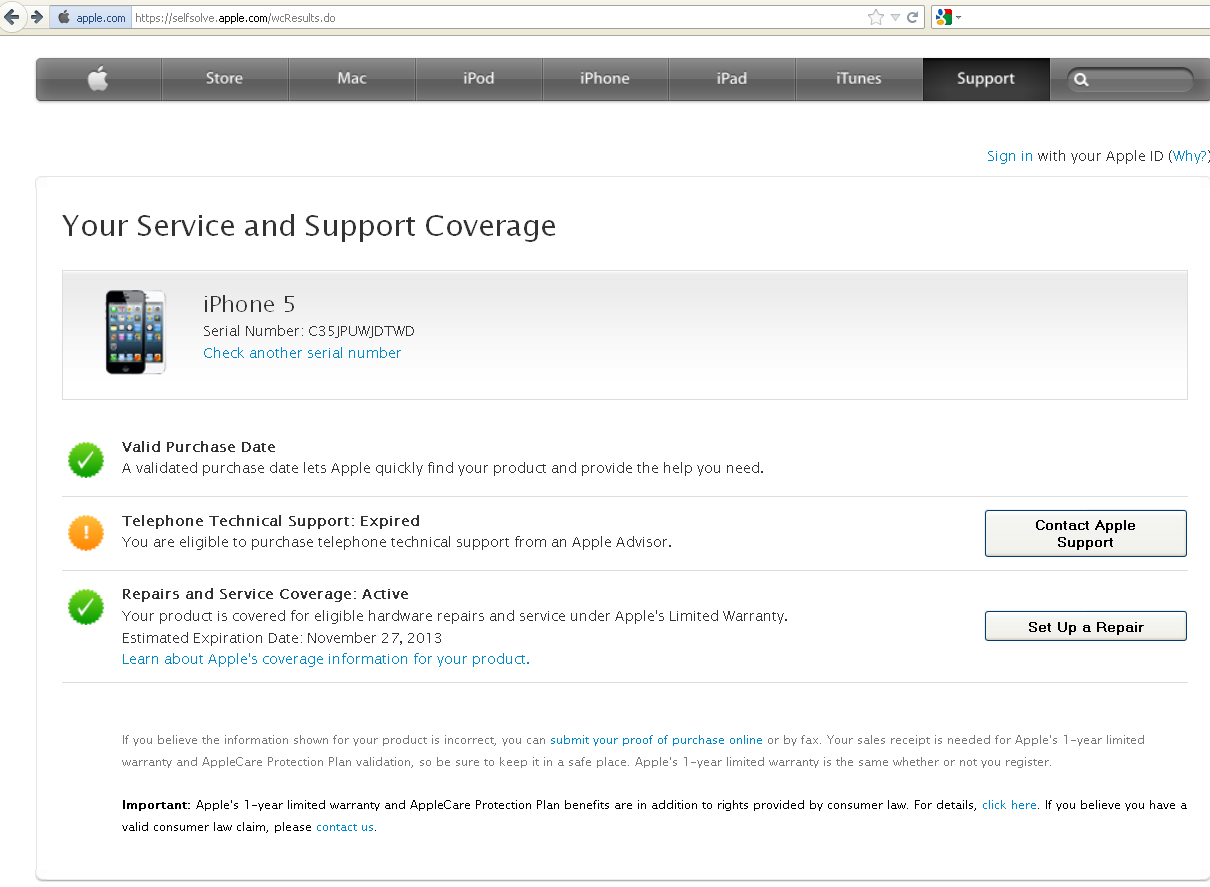 Με την πρώτη ματιά, η συσκευασία δεν μαρτυρά ότι πρόκειται για ψεύτικο iPhone. Ο προμηθευτής του «iPhone 5 με 30 ευρώ» δεν σου επιτρέπει να ανοίξεις την συσκευασία και το μόνο που μπορεί κανείς να εξετάσει είναι τι αναφέρεται σε αυτήν. Οι πιο.. πονηροί, τσεκάρουν το serial number στο σάιτ της Apple (από το Android τους). Βρίσκεται τυπωμένο σε αυτοκόλλητο στο πίσω μέρος της συσκευασίας και αφού το διακρίναμε με ανεκτή δυσκολία το πληκτρολογήσαμε στο https://selfsolve.apple.com/agreementWarrantyDynamic.do. Ο αριθμός σειράς έχει «έγκυρη ημερομηνία αγοράς», η περίοδος δωρεάν τηλεφωνικής υποστήριξης έχει εκπνεύσει, μπορούμε όμως να το πάμε στο service έως τις 27 Νοεμβρίου 2013 (καλύπτονται και τα ανταλλακτικά)!