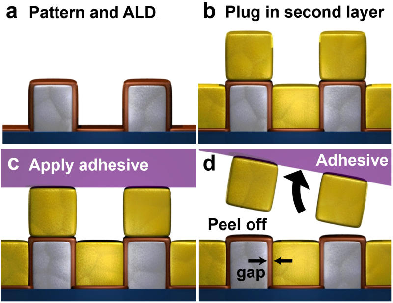 Σχηματική απεικόνιση της νέας τεχνικής. Η κολλητική ταινία (adhesive) απομακρύνει ένα στρώμα μετάλλου και αφήνει πίσω της μικροσκοπικά κενά (gap). Πηγή: University of Minnesota