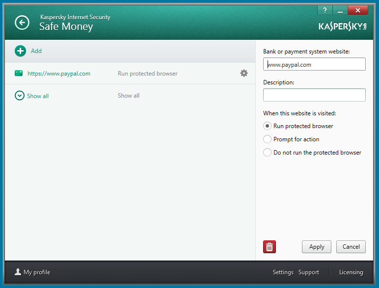 Όπως εξηγούν οι ειδικοί στα εργαστήρια AV-Test, όταν ο χρήστης χρησιμοποιεί τις υπηρεσίες e-banking, δηλαδή στον τραπεζικό του λογαριασμό μέσω Διαδικτύου, τα προγράμματα ασφάλειας της Kaspersky φορτώνουν ένα ασφαλές πρόγραμμα πλοήγησης (protected browser) που εξετάζει όλα τα σάιτ που επισκέπτεται, μπλοκάρει τα σάιτ που επιχειρούν να «ψαρέψουν» («phishing») κωδικούς εισόδου μασκαρεμένα σε έγκυρα σάιτ τραπεζών και απαγορεύει σε άλλα προγράμματα στο ίδιο σύστημα να δουν ό,τι βλέπει ο browser. O ασφαλής αυτός πλοηγός, δεν επιτρέπει να χρησιμοποιηθούν προγράμματα που καταγράφουν οτιδήποτε πληκτρολογεί ο χρήστης, δηλαδή μπλοκάρει τους λεγόμενους keylogger, αλλά και την λήψη screenshot (αντίγραφο της τρέχουσας οθόνης) και φυσικά, την αδιόρατη μεσολάβηση τρίτου ύποπτου προγράμματος σε όσα συμβαίνουν στον browser. Επιπλέον, η Kaspersky προτείνει την χρήση εικονικού πληκτρολογίου για την εισαγωγή κωδικών και PIN για να θωρακίσει περισσότερο την ευαίσθητη επικοινωνία.