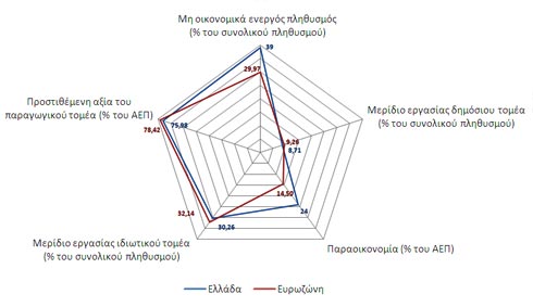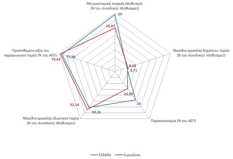 Η Ελληνική οικονομία λοιπόν χαρακτηρίζεται αφενός από πολύ υψηλή παραοικονομία και μεγάλο αριθμό οικονομικά ανενεργών ατόμων και αφετέρου από χαμηλό αριθμό εργαζομένων στον ιδιωτικό τομέα και από αναποτελεσματικότητα στο δημόσιο τομέα.