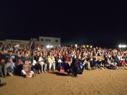 Η παράσταση άρχισε γύρω στις 21:30, ενώ από νωρίς οι φωνές του Ρίτσου, του Κατράκη, του Αναγνωστάκη, του Βέγγου (και άλλων που πέρασαν από το κολαστήριο της Μακρονήσου στα πέτρινα εμφυλιακά και μετεμφυλιακά χρόνια) απλώνονταν στον ξερό τόπο με το θυμάρι, τα σχίνα και τα εναπομείναντα χαλάσματα και κτίσματα που πέρασαν σε μια δεκαετία (από το 1947-1958) 100 χιλιάδες αγωνιστές.