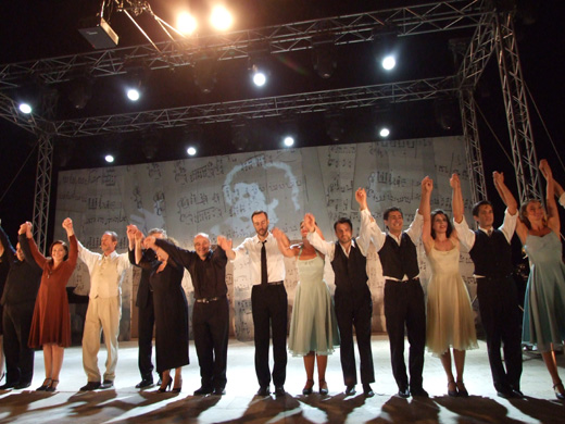 Με ένα κινηματογραφικό φλας μπακ ο θίασος των τραγουδιστών (Γιώτα Νέγκα, Κώστας Μακεδόνας, Κώστας Θωμαϊδης, Άννα Λινάρδου), της ορχήστρας και ηθοποιών (Ο Άρης Λεμπεσόπουλος υποδυόταν τον μουσικοσυνθέτη, ο Γρηγόρης Βαλτινός και πολλοί ακόμη) ψηλάφισε την ζωή του Μίκη και με καμβά τα γεγονότα της νεότερης Ιστορίας έγραψε μια σελίδα μνήμης και ανάτασης με δεκάδες τραγούδια του μεγάλου δημιουργού από το ευρύ, πυκνό και τεράστιο έργο του και με στιγμές από τον συναρπαστικό του βίο που ταυτίζεται με όλα τα νεότερα κοινωνικοπολιτικά γεγονότα. Η σκηνή είχε στηθεί μπροστά από το κτίριο των αρτοκλιβάνων, σε απόσταση αναπνοής από το λιμάνι. Στην παράσταση έλαβαν μέρος 25 ηθοποιοί και χορευτές, τέσσερις τραγουδιστές και έντεκα μουσικοί που συμμετείχαν αφιλοκερδώς.