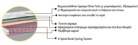 Με τεχνολογία Clima Tech το συγκεκριμένο στρώμα θα κρατήσει τη θερμοκρασία του σώματός σας σταθερή κατά τη διάρκεια του ύπνου. Διαθέτει υδροαπωθητική επιφάνεια και δύο ζώνες στήριξης soft & firm.