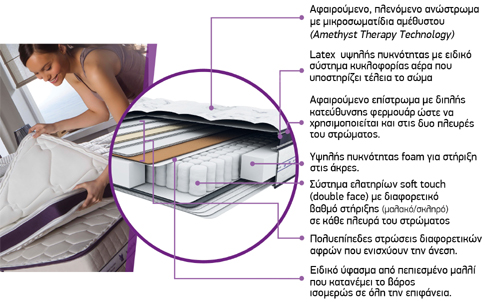 Ξαπλώστε πάνω στο εξαιρετικό ύφασμα με μικροσωματίδια αμέθυστου. Η Τεχνολογία Amethyst Therapy έχει διαπιστωθεί επιστημονικά ότι απορροφά την αρνητική ενέργεια και ενισχύει την ηρεμία και τη χαλάρωση. To συγκεκριμένο στρώμα διαθέτει σύστημα ελατηρίων Soft Touch DoubleFace, που χαρίζουν ιδανικά επίπεδα στήριξης και άνεσης σε κάθε σημείο του σώματός σας. Επιπλέον, το διπλό επίστρωμα έχει διπλής κατεύθυνσης φερμουάρ ώστε να χρησιμοποιείται και στις δύο πλευρές του στρώματος. (Η κάθε πλευρά του στρώματος έχει διαφορετικό βαθμό στήριξης (σκληρή – μαλακή). Έτσι αναλόγως σε πόσο μαλακό/σκληρό στρώμα θέλετε να κοιμάστε, επιλέγετε την πλευρά που επιθυμείτε και κατόπιν τοποθετείτε το επίστρωμα.)