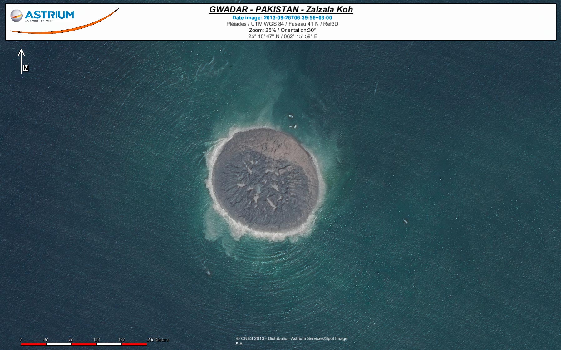 Το μυστηριώδες νησάκι που αναδύθηκε από τη Θάλασσα της Αραβίας μετά το σεισμό των 7,7 βαθμών στο Πακιστάν φωτογραφήθηκε από γαλλικό δορυφόρο, επιτρέποντας στους γεωλόγους να μετρήσουν τις διαστάσεις του.