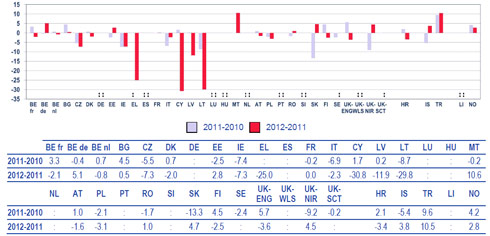 Σημείωση: EU-27: Ευρωπαϊκή Ένωση, EA-17: Ευρωζώνη, BE: Βέλγιο, BG: Βουλγαρία, CZ: Τσεχία, DK: Δανία, DE: Γερμανία, EE: Εσθονία, IE: Ιρλανδία, EL: Ελλάδα, ES: Ισπανία, FR: Γαλλία, IT: Ιταλία, CY: Κύπρος, LV: Λετονία, LT: Λιθουανία, LU: Λουξεμβούργο, HU: Ουγγαρία, MT: Μάλτα, NL: Ολλανδία, AT: Αυστρία, PL: Πολωνία, PT: Πορτογαλία, RO: Ρουμανία, SI: Σλοβενία, SK: Σλοβακία, FI: Φινλανδία, SE: Σουηδία, UK: Ην. Βασίλειο, IS: Ισλανδία, NO: Νορβηγία, CH: Ελβετία.