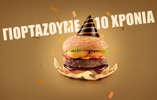 Σχεδόν 10 εκατομμύρια burgers μετά, γιορτάζουν τους τα 10 τους χρόνια με μια ειδική, εορταστική προσφορά. Για 10 μόνο μέρες, μπορούμε να απολαύσουμε δύο ζουμερά Classic with cheese, με country style πατάτες και τη διάσημη σως creole τους, μαζί με δύο παγωμένες Amstel, μόνο με 10€.