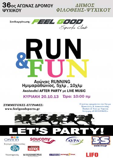 Αθλητική δραστηριότητα και διασκέδαση. Συμμετοχή σε αγώνα και party! Όλα τα έχει το 1ο «Run & Fun» event που διοργανώνει ο Δήμος Φιλοθέης-Ψυχικού, την Κυριακή 20 Οκτωβρίου 2013.