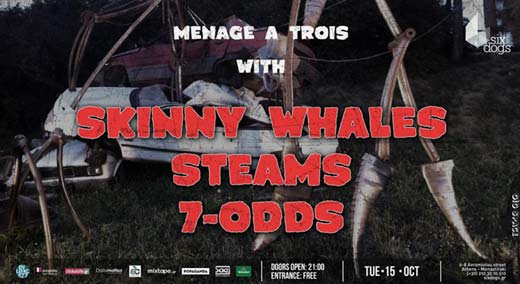 Τρεις νέες ελληνικές μπάντες συναντιούνται την Πέμπτη 15 Οκτωβρίου 2013 στη σκηνή του six d.o.g.s. Οι Skinny Whales, Τhe Steams και 7-Οdds περιμένουν το κοινό με rock ‘n’ roll, ψυχεδέλεια, garage και indie διαθέσεις. Οι Skinny Whales ή «κοκκαλιάρες φάλαινες» αν προτιμάτε, με ήχο και στυλ από την εναλλακτική σκηνή και επιρροές από συγκροτήματα όπως […]