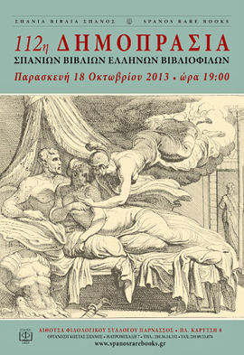 Ο Οίκος «Σπανός-Βιβλιοφιλία» θα διεξάγει την Παρασκευή 18 Οκτωβρίου την 112η Δημοπρασία Σπανίων Βιβλίων Ελλήνων Βιβλιοφίλων στον Φιλολογικό Σύλλογο «Παρνασσός» στη Πλατεία Καρύτση 8 και ώρα 19:00.