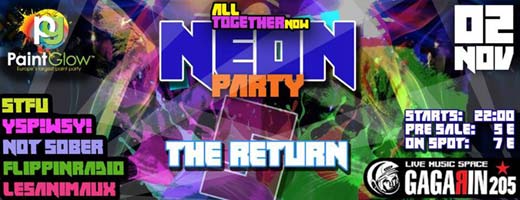 Ένα party με πολύ… χρώμα και τρέλα θα ζήσουν όσοι βρεθούν στο Gagarin 205, το Σάββατο 2 Νοεμβρίου 2013. To μοναδικό Neon party της Αθήνας μετράει ήδη τέσσερα συνεχόμενα sold out events και επιστρέφει για πέμπτη φορά στο χώρο του Gagarin 205. Glowsticks, τούρτες, σαμπάνιες, φουσκωτές βάρκες, φουσκωτές κούκλες, dancers και φυσικά 500 λίτρα Νeon […]