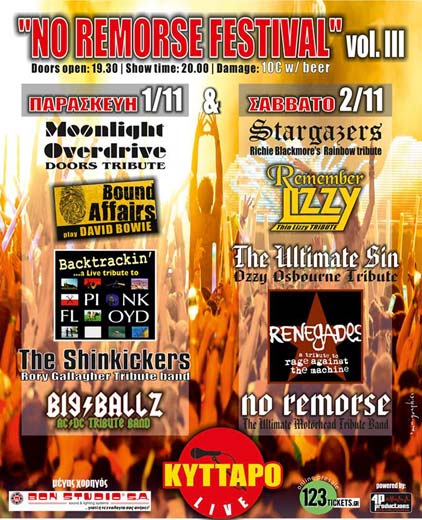 Σάββατο 2/11: Stargazers – Rainbow Tribute, Remember Lizzy – Thin Lizzy Tribute, The Ultimate Sin – Ozzy Osbourne Tribute, Renegades – Rage again the Machine Tribute, No Remorse – Motorhead Tribute.