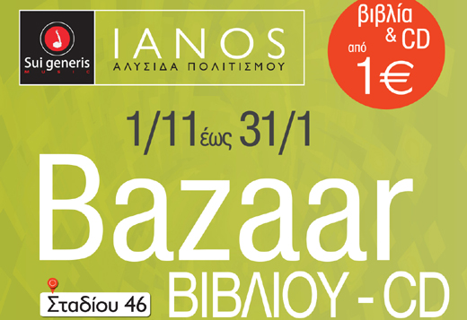 Το Ianos Bazaar μετακομίζει στον αριθμό 46 της Σταδίου, και σε συνεργασία με την Sui Generis Music, διοργανώνει παζάρι βιβλίου και CD του ελληνικού και ξένου ρεπερτορίου, σε τιμές που ξεκινούν από 1€.