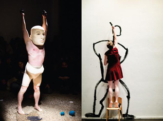 Λήδα Παπακωνσταντίνου Από τις πρώτες εκπροσώπους της performance στην Ελλάδα, στην εγκατάσταση «Επισκέπτες» χρησιμοποιεί εικόνες-σύμβολα με αναφορές στο οικείο περιβάλλον και στην αίσθηση της απουσίας. Ο θεμέλιος τόπος για την καλλιτεχνική δημιουργία κατοικείται από εικόνες – σύμβολα, τα οποία η καλλιτέχνις δεν αφήνει να διατηρήσουν τη σταθερότητα των συμβατικών τους νοημάτων. Μόνιμα ανατρέπει τη σημασία τους.