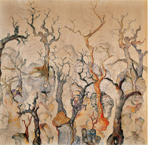 Ο καθηγητής της Α.Σ.Κ.Τ. Γιάννης Ψυχοπαίδης γράφει για το έργο της στον ομότιτλο κατάλογο: «Στο κλίμα μιας αδρής ποιητικής γραφής κινείται η ζωγραφική της Ντένης Θεοχαράκη, ένα κλίμα που τόσο εύγλωττα – σαν δημοτικό τραγούδι – εκφράζει ο υπερρεαλιστικός στίχος του Οδυσσέα Ελύτη «βράχοι καλόγεροι με κρύα μαλλιά κόβουνε σιωπηλοί της ερημιάς τον άρτο». Οι βράχοι, η ερημιά, η σιωπή, ποιητικές εικόνες μεγάλης γλωσσικής πυκνότητας στον Ελύτη, γίνονται εδώ, στην έκφραση της Ντένης θεοχαράκη, εικαστικές φόρμες από ένα προσωπικό λεξιλόγιο που λυρικά καταγράφει μια νέα αισθητική εικονογραφία της γης, μια τοπιογραφία του αρχέγονου και του πρωταρχικού, μια μορφολογία ενός άγονου, άγριου, αλλά παρ’ όλα αυτά κατοικημένου εδάφους … Η φύση δεν αντιγράφεται, δεν αναπαρίσταται εικονογραφικά, αλλά ούτε στέκεται σαν αφορμή για μια απλοϊκή διακοσμητική καλλιγραφία. «Η ακρίβεια δεν είναι η αλήθεια», έλεγε ο Matisse, κι αυτό εδώ έχει την ισχύ του. Η συγκινησιακή ένταση στη ζωγραφική της Ντένης Θεοχαράκη είναι αυτή που απο-δομεί και ανα-δομεί τη φύση και αναζητά την αλήθεια μιας «άλλης» ακρίβειας, αναζητά μορφές αποδεσμευμένες από την αναπαράσταση, αλλά δεσμευμένες από την ευαισθησία, την εκφραστική δύναμη, τη λυρική έμπνευση και το ανήσυχο πνεύμα του δημιουργού.»