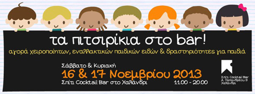 Η διοργάνωση συμπεριλαμβάνει και ένα πρωτότυπο bazaar παιδικών ειδών από τους σημαντικότερους δημιουργούς και εμπόρους χειροποίητων εναλλακτικών ειδών που απευθύνονται στους μικρούς φίλους (έως 9 ετών) αλλά και στις ανάγκες της μελλοντικής μαμάς. Ρούχα, παιχνίδια, αξεσουάρ, μωρουδιακά, είδη βάφτισης και παιδικού πάρτυ, σχολικά, κ.ά. είναι μόνο μερικά από τα είδη που μπορεί κανείς να δει και να προμηθευτεί στα «Τα Πιτσιρίκια».