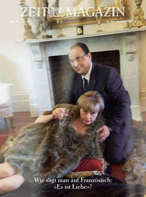 Στο εξώφυλλο του περιδικού της εφημερίδας Die Zeit εμφανίζεται η Άνγκελα Μέρκελ ξαπλωμένη σε ένα μαξιλάρι με ένα ποτήριο σαμπάνια στο χέρι, και ο Φρανσουά Ολάντ πίσω της την κρατά από τους ώμους. Εκείνος είναι χαμογελαστός, εκείνη πάντως όχι.