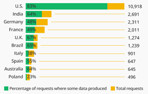 Το διάστημα Ιανουάριος-Ιούνιος 2013 ο γίγαντας του διαδικτύου δέχτηκε 25.879 αιτήματα, από τα οποία το 42% προήλθαν από την αμερικανική κυβέρνηση. Την πρώτη πεντάδα συμπληρώνουν κατά σειρά η Ινδία, η Γερμανία, η Γαλλία και η Βρετανία.