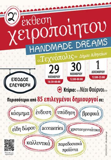 Για δεύτερη συνεχή χρονιά η Τεχνοπόλις του Δήμου Αθηναίων φιλοξενεί την έκθεση χειροποίητου Handmade Dreams, από τις 29 Νοεμβρίου έως την 1η Δεκεμβρίου 2013.