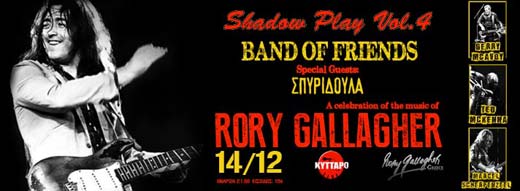 Για τις δυο συναυλίες αφιέρωμα στον Rory Gallagher, επιστέφουν στη χώρα μας οι «Band of Friends», φίλοι, συνοδοιπόροι και καλύτεροι εκφραστές της μουσικής του, ενώ μαζί τους στη σκηνή, στο live της Αθήνας, θα βρεθούν οι «Σπυριδούλα», το ζωντανό συγκρότημα-θρύλος της ελληνικής rock σκηνής. Τη συναυλία στη Θεσσαλονίκη θα ανοίξουν οι «The U.N».