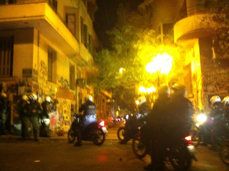 Η πλατεία Εξαρχείων ήταν περικυκλωμένη επί ώρες από τα ΜΑΤ. Νωρίτερα έγινε εκτεταμένη χρήση χημικών στην πλατεία, όπου βρίσκονταν συγκεντρωμένα εκατοντάδες άτομα.