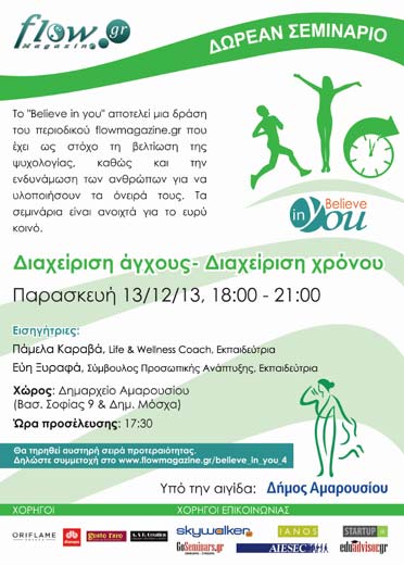 Ο λόγος για το σεμινάριο με θέμα «Διαχείριση Χρόνου-Διαχείριση Άγχους» το οποίο ανήκει στον κύκλο δωρεάν σεμιναρίων «Believe in you» που είναι ανοιχτά για το ευρύ κοινό και αποτελεί το τέταρτο σεμινάριο κατά σειρά. Ο κύκλος των σεμιναρίων αυτών είναι μια πρωτοβουλία του ηλεκτρονικού περιοδικού Flowmagazine.gr με την υποστήριξη του Δήμου Αμαρουσίου.Το σεμινάριο που θα πραγματοποιηθεί στις 13/12 έχει σκοπό να παρουσιάσει τις αιτίες της κακής διαχείρισης χρόνου, τρόπους και συμβουλές για να γίνουμε πιο οργανωμένοι, ενώ μας εξηγεί ποιοι είναι οι παράγοντες του άγχους και πώς μας επηρεάζει.