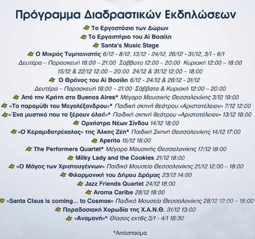 Οι μικροί φίλοι του Mediterranean Cosmos θα έχουν την ευκαιρία να γιορτάσουν και να διασκεδάσουν με πρωτότυπα χριστουγεννιάτικα εικαστικά εργαστήρια, παραστάσεις, αφήγηση αγαπημένων κλασικών διηγημάτων, μουσικοκινητικό και θεατρικό παιχνίδι, και πολλές ακόμα εκπλήξεις… … στο Εργαστήριο του Αϊ Βασίλη, το Εργοστάσιο των Δώρων, το Santa’s Music Stage, το Θρόνο του Αϊ Βασίλη και τον Μικρό […]