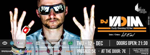 Λίγα λόγια για τον DJ Vadim Από τις πρώτες προσθήκες στο roster της Ninja Tune, ο Vadim ξεκίνησε να πειραματίζεται με beats και samplers όταν κυκλοφόρησε το αναγνωρισμένο από τους κριτικούς «USSR Repertoire». 70 κυκλοφορίες μέχρι σήμερα, ραδιοφωνικές εκπομπές, ιδρυτικό μέλος ενός label και αρκετών σχημάτων, εκ των οποίων κάποια υποψήφια για Grammy award (7 Notas 7 Colores, Russian Percussion, One Self, Jazz Fudge), συμμετοχή σε άπειρα Dj playlists, περιοδείες και εμφανίσεις σε ολόκληρη την Ευρώπη, την Ιαπωνία, τη βόρεια και λατινική Αμερική, τη Νεα Ζηλανδία, ακόμα και την Ασία.